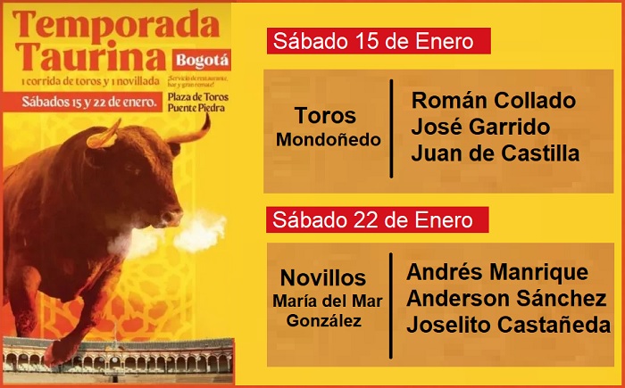 – Sábado 26 de enero, 3:00 p.m. – Novillos de la ganadería de María del Mar Gonzáles (Ernesto González Caicedo) encaste Santacoloma para los novilleros punteros nacionales: Andrés Manrique, Anderson Sánchez y Joselito Castañeda.