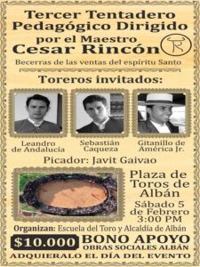 El próximo sábado 05 de febrero este ejercicio tendrá las puertas abiertas al público a partir de las tres de la tarde (3:00 p.m.) en la plaza de toros de Albán (Cundinamarca) donde con reses de la ganadería local, Las Ventas del Espíritu Santo, el Maestro Cesar Rincón dirigirá el tercer tentadero pedagógico con la participación de los Matadores Leandro de Andalucía y Sebastián Cáqueza, así como del novillero Gitanillo de América Jr. El bono de contribución será de $10.000 pesos por persona y se podrán adquirir ese día en la misma plaza.