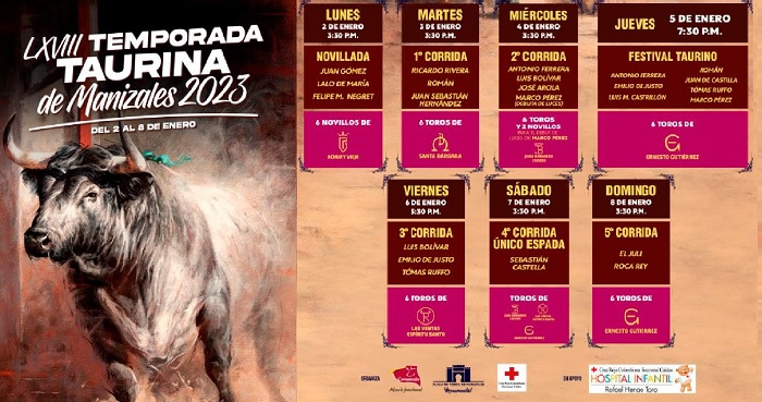 – Miércoles 04 de enero 2023 – 3:30 de la tarde – Toros y Novillos de Juan Bernardo Caicedo, propiedad de Don Juan Bernardo Caicedo, encaste Conde de la Corte – Torestrella – Torrealta para Antonio Ferrera, Luis Bolívar, José Arcila y el debut en luces de Marco Pérez.