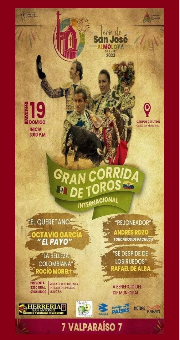 Almoloya, Edo. de Méx.– Plaza portátil. Corrida de toros. Media entrada en tarde soleada. Siete toros de Valparaíso de juego variado para el rejoneador Andrés Pozo y los matadores Octavio García «El Payo» y Rocío Morelli.