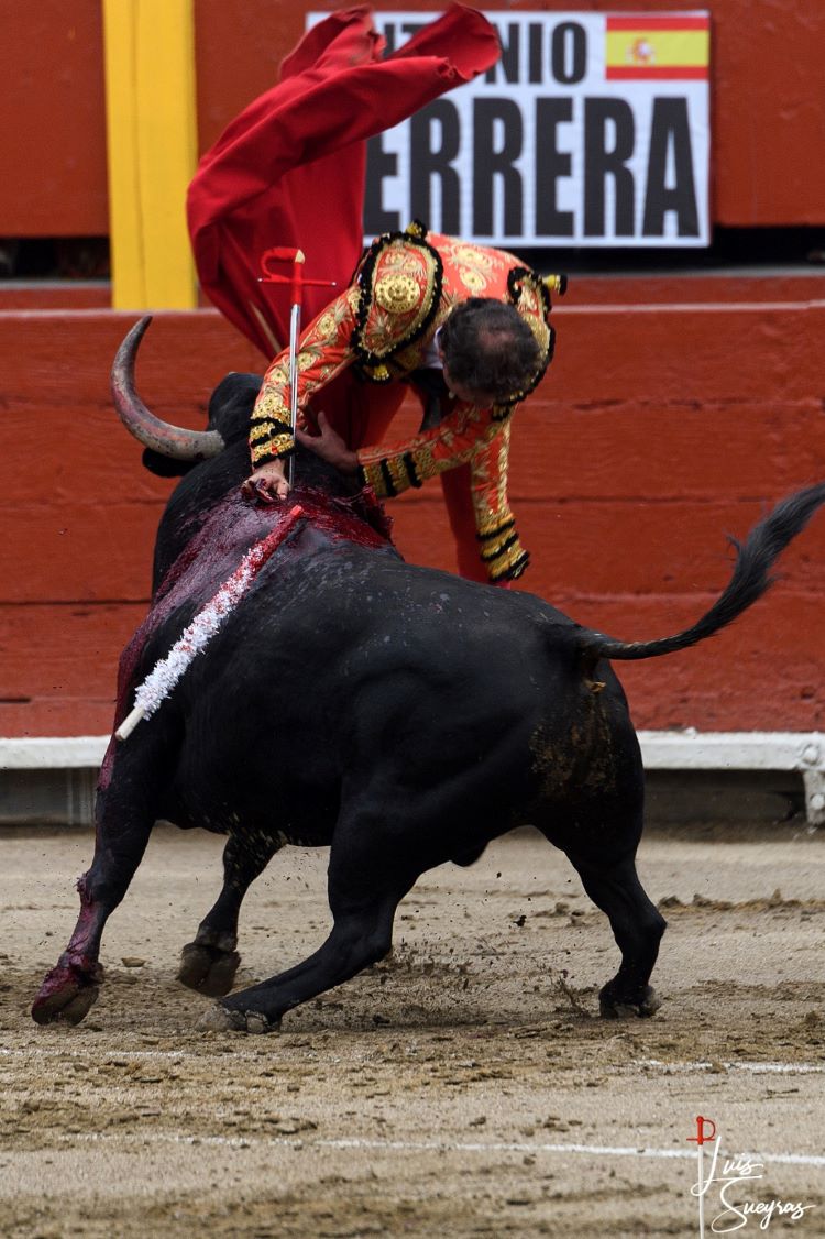 tuvo fondo pero justo de fuerza, tuvo cierta nobleza pero mucha técnica de Fererra que le permitió faena en los medios por la derecha con mano baja. El toro humillaba y el matador cuajó varias tandas en base a técnica y voluntad. Al entrar a estoquear fue cogido dos veces de manera aparatosa sin mayores consecuencias. Al tercer intento dejó una estocada enterar algo desprendida. Silencio para el matador.