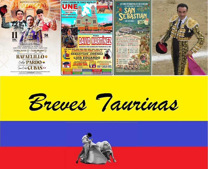 – El Matador de Toros colombiano Cristóbal Pardo (anunciado para el 8 de diciembre en Villapinzón), toreará en la ciudad peruana de Macusani, distrito de su mismo nombre, provincia de Carabaya, en el departamento de Puno, el día 11 de diciembre, esta ciudad se caracteriza por estar a 4,315 metros de altura, por lo se prevé enormes esfuerzos para toros y toreros. Allí el diestro caldense estará acompañado por el español Rafael Rubio «Rafaelillo» y Juan Carlos Cubas y estarán ante astado de los hierros Checayani y Colorado.