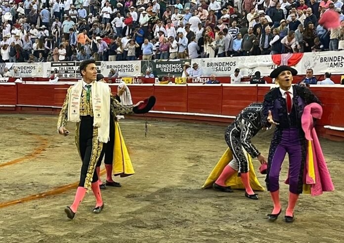 Luis Bolívar – azul turquesa, oro y cabos blancos. Con Jinete, un melocotón, Bolívar lanceó con suavidad. Poca pica. Con la muleta muy planchada Luis desarrollo una faena muy inteligente, muletazos largos y templados. Trazos lineales que tomaban curva en torno a su humanidad. Pronto vino la mano izquierda para llevar las embestidas codiciosas de Jinete. Todo fue con lentitud mientras los acordes sonaban en el palco alto. Los tiempos y la medida del caleño acompasaron el paso de buen toro. Manoletinas al cierre para dar paso al acero, que cual largo es entró un poco tendida en las carnes del melocotón. Cruceta y adiós a los trofeos. Palmas al toro. Saludo desde el tercio. Con el cuarto Bolívar recogió las embestidas con mucha técnica. A la pica Luis dejó al astado en el centro del ruedo desde donde con un galope franco el toro partió hacia el caballo. De las tablas al centro con muletazos templados Bolívar llevó prendado al bonito toro de Santa Bárbara. La faena desde ese momento cogió talante. Temple y mando con suavidad en cada muletazo. Mató de estocada. Una oreja y vuelta al ruedo al toro.