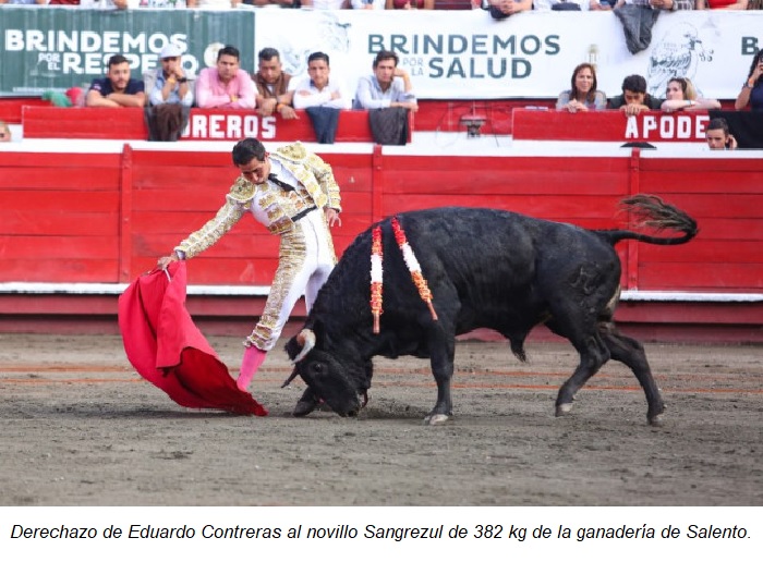 El novillero con caballos Eduardo Contreras fue el encargado de poner la tarde en lo alto tras cortarle una oreja al novillo Sangreazul de 382 kg. Con una faena destacada recibió el premio desde el palco de Usía y los aplausos del público.