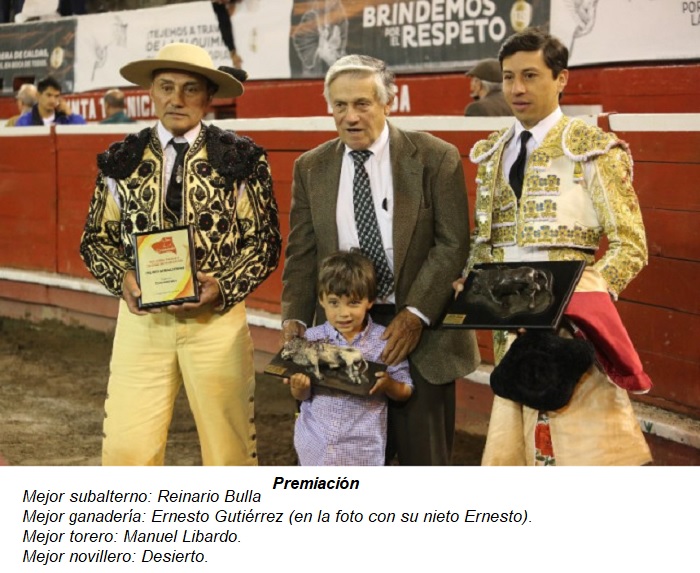 El torero de Ubaté Manuel Libardo obtuvo su cupo para la Feria de Manizales tras cortarle dos orejas al toro Abanderado de 584 kg de la ganadería de Ernesto Gutiérrez. Fue reconocido como el mejor torero la temporada de Toros y Ciudad.