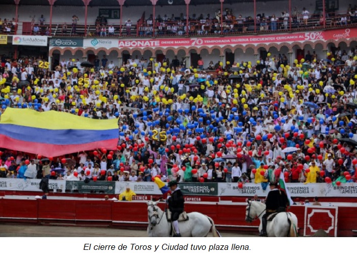 La lluvia de la tarde de este domingo (13 de octubre) en Manizales no fue impedimento para que la Plaza de Toros se llenara y la afición local apreciara el cierre de la edición 25 de la Feria de Toros y Ciudad. Los toros de la ganadería de Ernesto Gutiérrez bien presentados y de juego desigual. La suerte suprema fue el punto más bajo de los matadores.