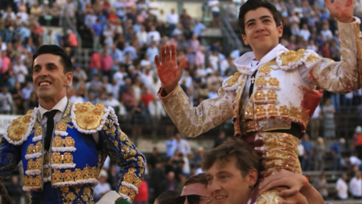 Marco Pérez, que tomaba la alternativa, de blanco y oro: ovación tras aviso y dos orejas.