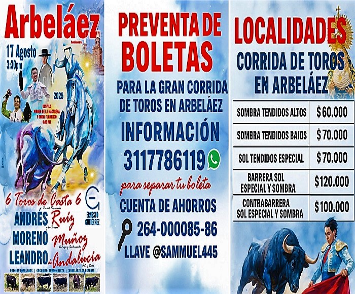Boletas disponibles a través del WhatsApp 3117786119 y Cuenta de Ahorros 264-000085-86, Llave @SAMUEL445. Localidades: Sombra Tendidos Altos $60.000, Sombra Tendidos Bajos $70.000, Sol Tendidos Especial $70.000, Barrera Especial Sol y Sombra $120.000, Contrabarrera Sol Especial y Sombra $100.000. ¡Todos a los Toros en Arbeláez!