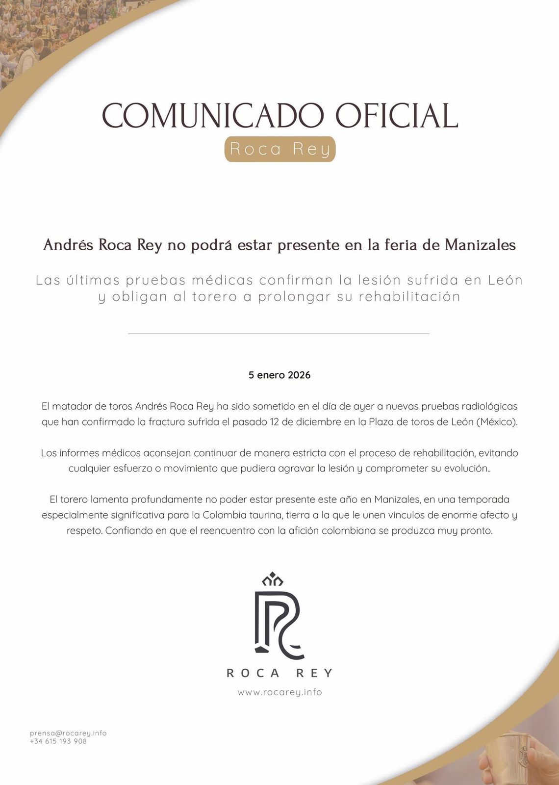 “El matador de toros Andrés Roca Rey ha sido sometido a nuevas pruebas radiológicas que han confirmado la fractura sufrida en la Plaza de toros de León. Los informes médicos aconsejan continuar de manera estricta con el proceso de rehabilitación, evitando cualquier esfuerzo o movimiento que pudiera agravar la lesión y comprometer su evolución.El torero lamenta profundamente no poder estar presente este año en Manizales, en una temporada especialmente significativa para la Colombia taurina, tierra a la que le unen vínculos de enorme afecto y respeto. Confiando en que el reencuentro con la afición colombiana se produzca muy pronto”.